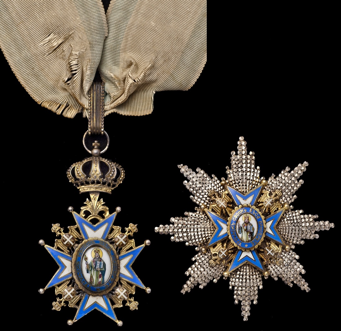 Serbia. Order of Saint Sava. Grand Officer's Set. 2nd Class. Silver, gilt and enamels. Neck Badge, 85mm (from tip of crown suspender) and Breast Star, 85 x 83mm. Cross: St. Sava with green robes and yellow nimbus on medallion at center of central cross framed in blue and white enamel, Arms on double-headed eagle in each angle. "1883" in wreath on back of Cross. On neck ribbon. Light crackling of cross enamel. Extremely Fine.