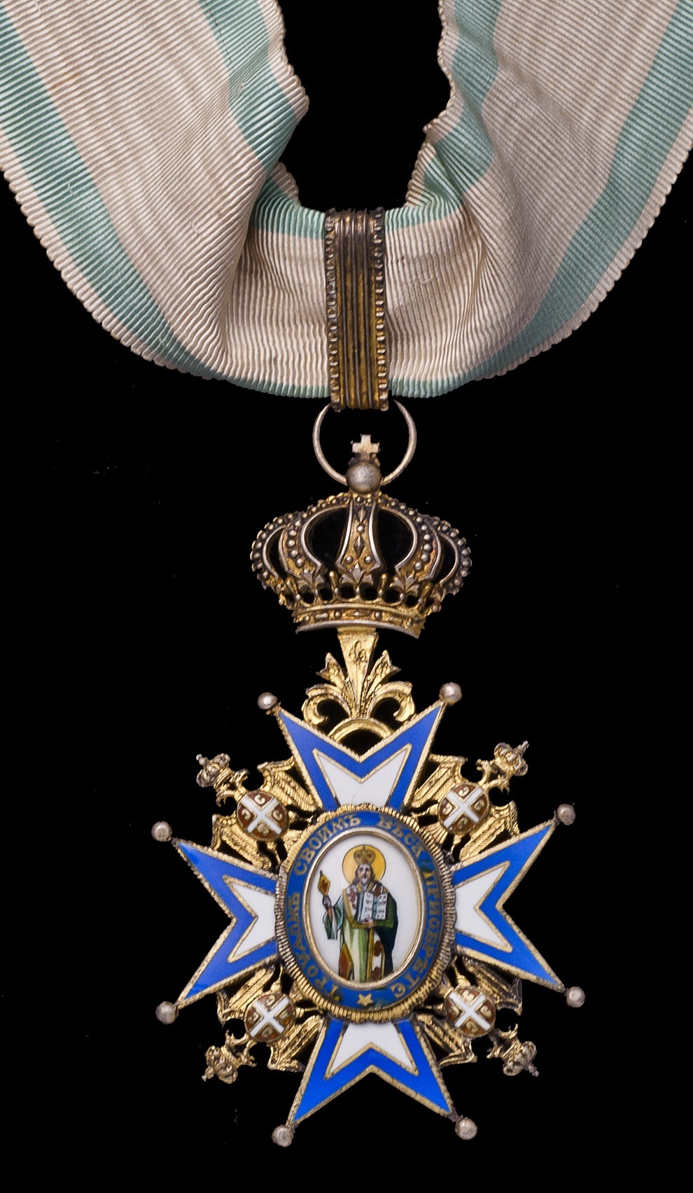 Serbia. Order of Saint Sava. Neck Badge. 3rd Class. Silver, gilt and enamels. By Huguenin Frères, Le Locle. 64 mm (excluding crown suspender). St. Sava with green robes and multicolor at center on white medallion set on blue and white enamel cross, Arms on double-headed eagle in angles, "1883 in wreath on back. On neck ribbon. In original Huguenin case. Extremely Fine.