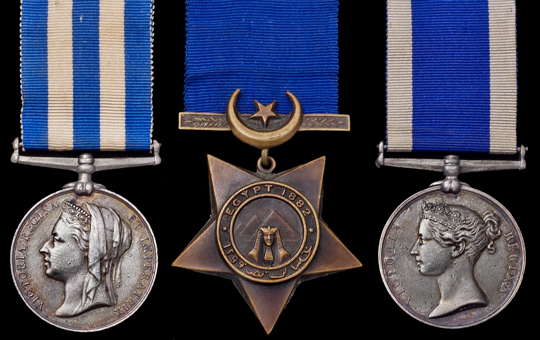 Great Britain. Three to John Fright, Engine Room Artificer, Royal Navy: Egypt Medal, 1882-1889 (J. FRIGHT A.G.E. R. ARTF R: H.M.S. "THALIA".); Khedive's Star, 1882; and Royal Navy Long Service and Good Conduct Medal. Victoria (JOHN FRIGHT, E.R.A., H.M.S. MERSEY.) On ribbons. Good Very Fine. (3).