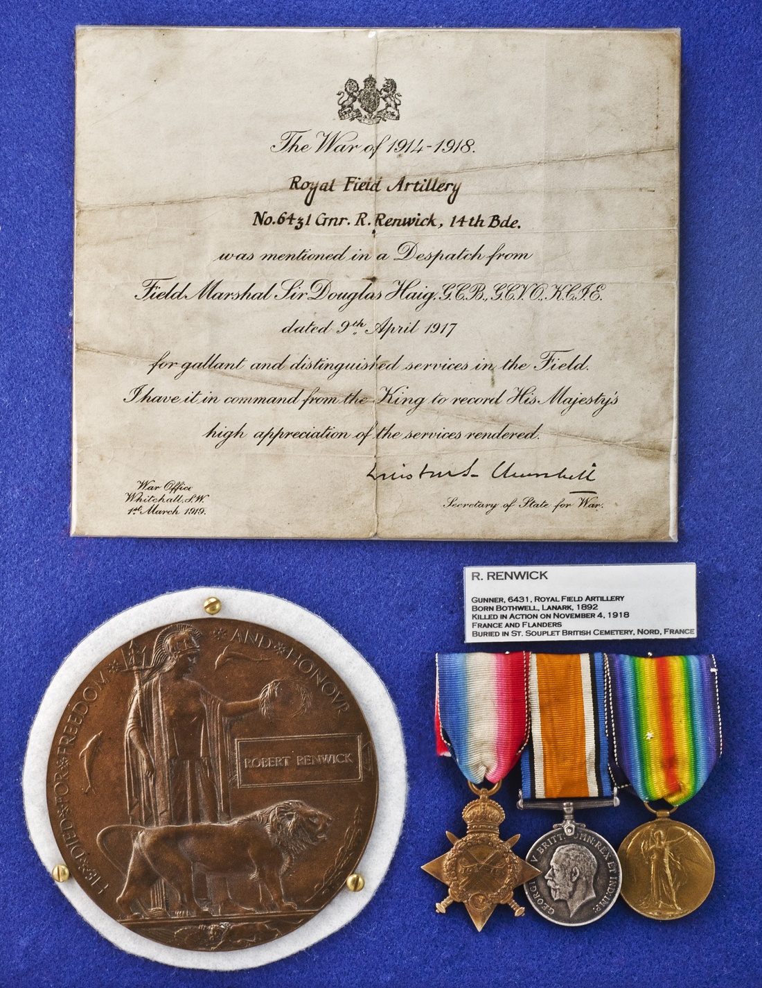Great Britain. World War I Trio to Gunner R. Renwick, Royal Field Artillery. Killed in Action in Flanders, Nov. 4, 1918. 1914-15 Star (6431 GNR: R. RENWICK. R.F.A.) and British War and Victory Medals. With Memorial Plaque and April 9, 1917 despatch mention. In display (ribbons stapled). Extremely Fine. (5)