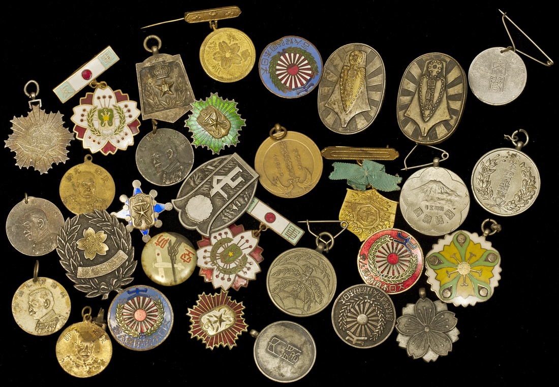 Japan. Collection of Badges and Medallets, ca. WWI-II era. Military, societies and associations, donative, etc. Mostly small size in silver, bronze, nickel, enamel (9), one in aluminum; and three somewhat large silver badges; also celluloid WWII button showing plane and anti-aircraft gun. Good VF-EF. Interesting group and worth further research. (31)