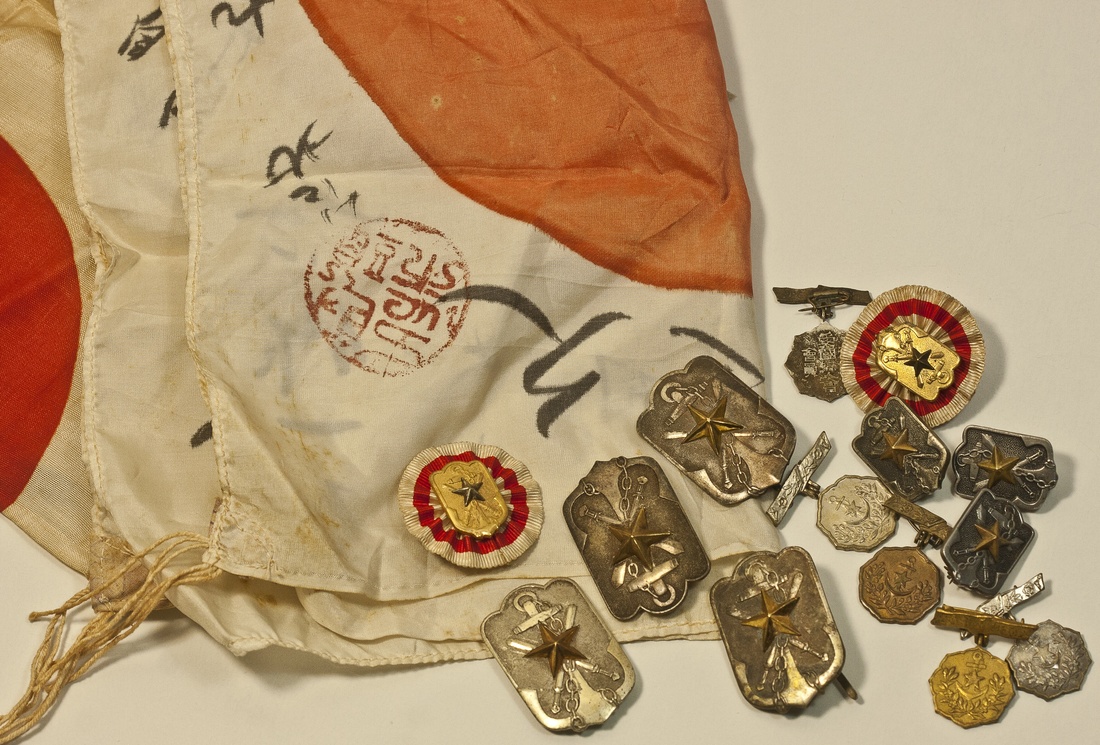 Japan. WWII lot. Includes Rising Sun flags (2) - one with black inked characters, two red guilloches around, and plain, approx.. 16 x 13"; Imperial Veterans' League Badges - Members badges: large size (4), small size (3), vertical pinback shield with gilt star; Registration badges (2), gilt badge on rosette; Patriotic Ladies Society membership badges (5) silverplate and brass. VF-EF. (16)