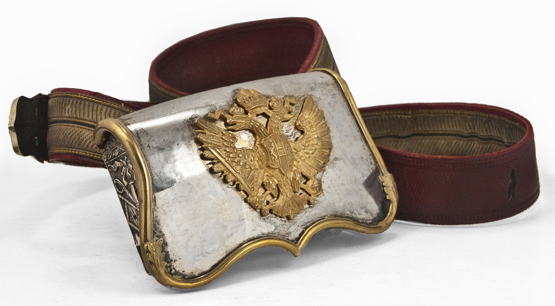 Austro-Hungary. Uhlan's Cartouche (Powder Pouch). Gilt edged, unmarked silver metal face with applied Imperial eagle, monogram of Emperor Karl II on its breast. Reverse and pouch body in red leather with finely stamped edges, each displaying a trophy of arms. Bullion thread and ornate silver fittings on red leather belt. Metal clasp at bottom of pouch replaced. Extremely Fine.