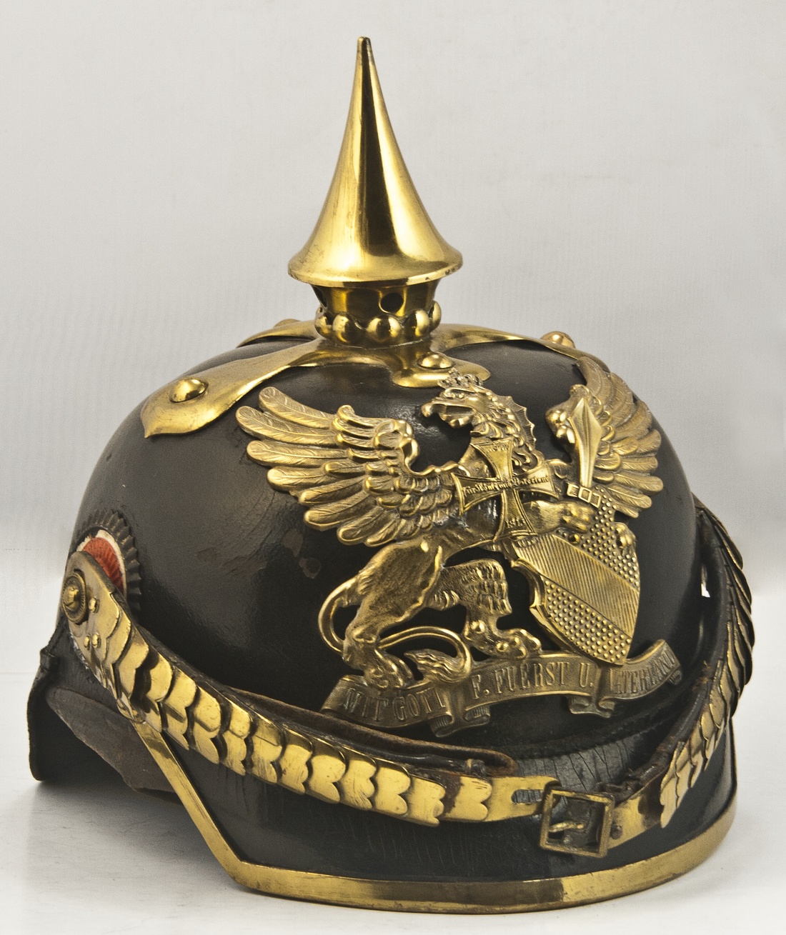 German States. Baden. Landwehrkreuz (Reserves) Dragoons, non-commissioned Officer's 1894 Model Pickelhaube. Black leather body topped by distinctive kreuzformig Unterlage -- brass spike with cruciform mounting. Large front plate depicts crowned gryphon supporting Baden shield, motto on scroll below. Brass chin scales, leather backed, kokarde at sides. The fittings including the pearl ring indicate this helmet was worn by a NCO of the 20-22 Regiments of Dragoons. Squared front visor, plain rear spine with extra middle securing stud. Wear on leather sweatband and inside metal plate. Very minor scuff of body front right. A Very Good and pleasing helmet.