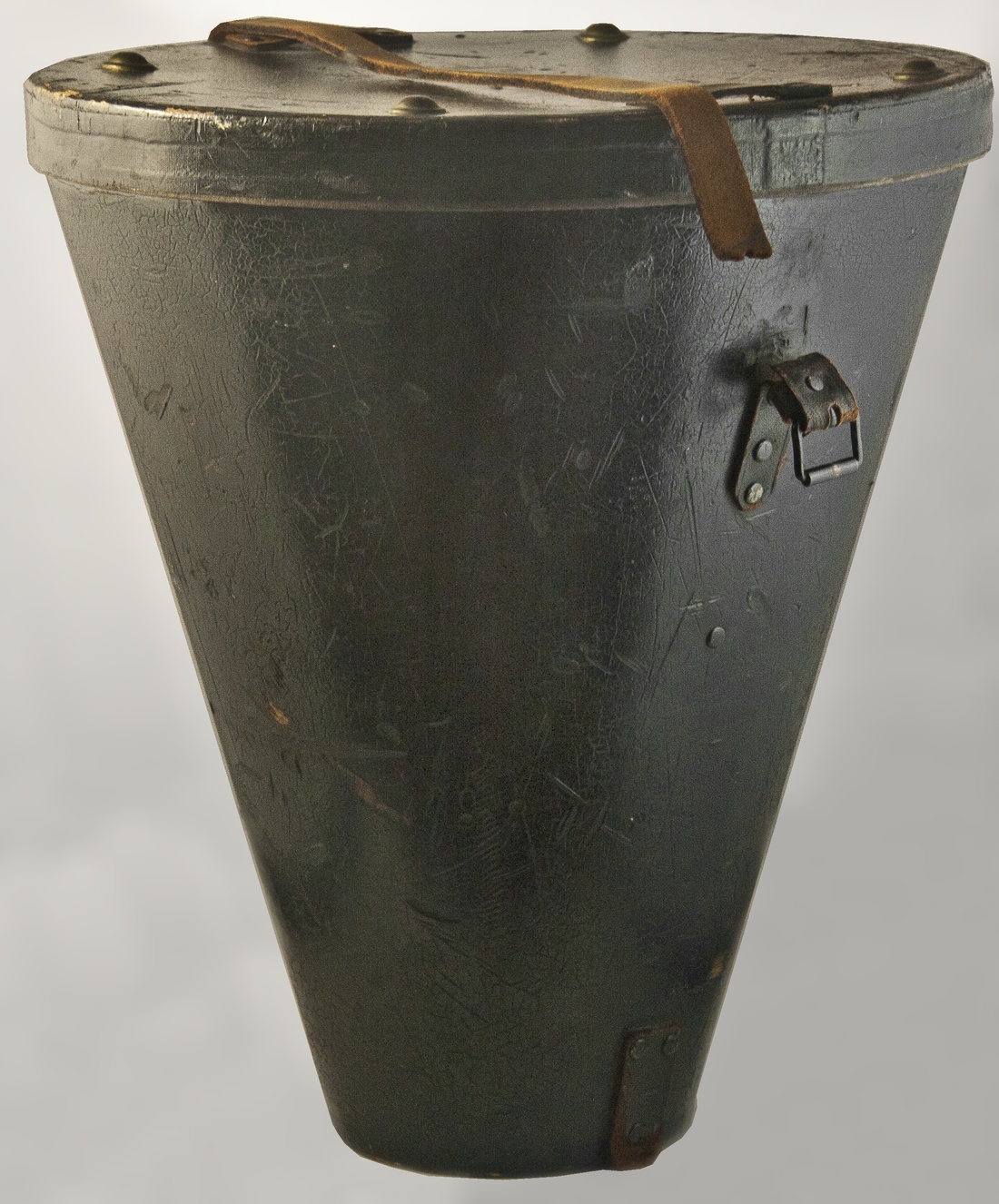 German States. Carrying Case for Pickelhaube. Conical black leather case with retaining strap, buckle and carrying loop, four studs on top lid. Silk-lined interior. Typical scuffs, some soiling of lining, tip of strap missing.