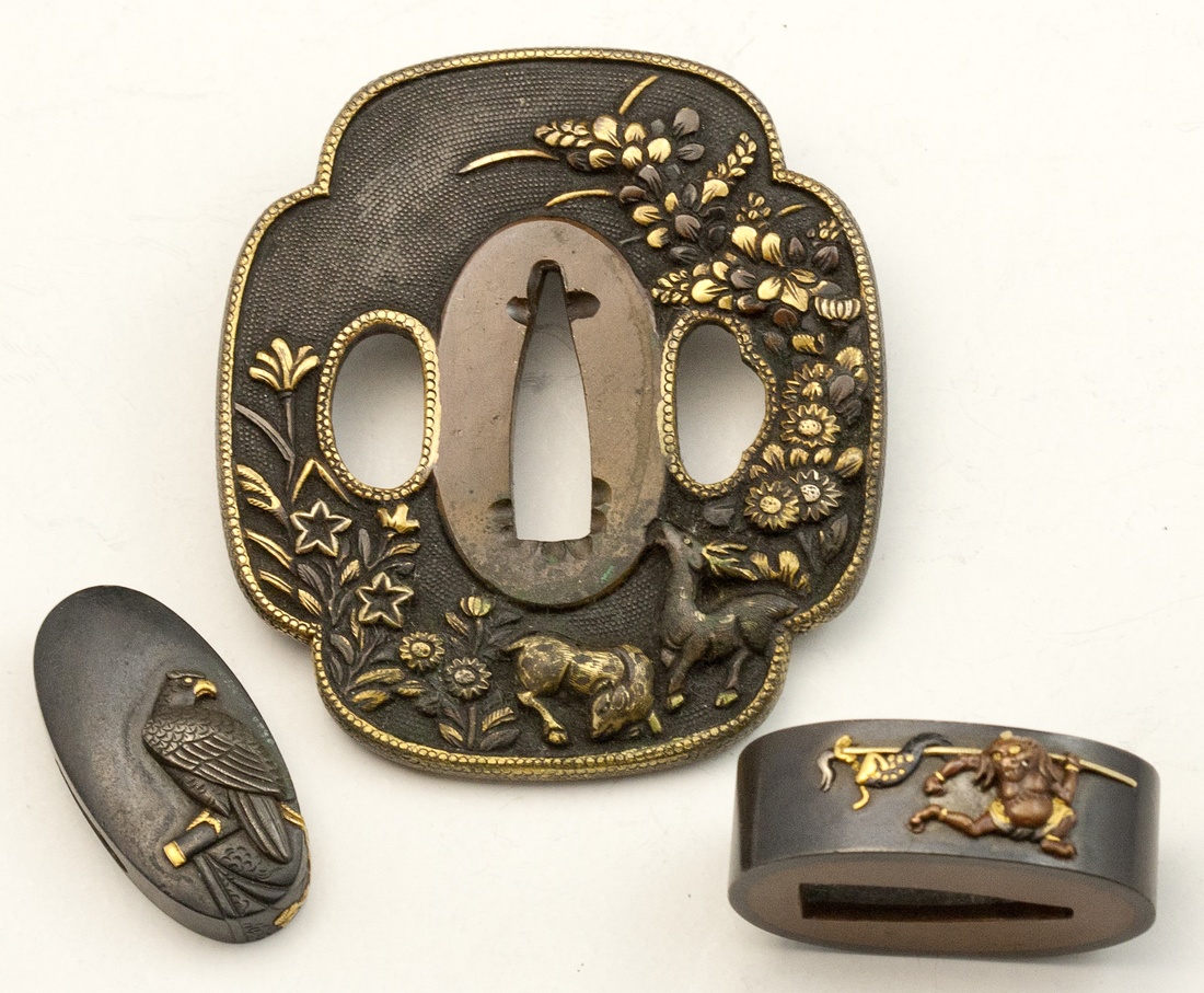 Japan. Tsuba, Fuchi and Kashira for Samurai Katana. 20th Century. Copper. The tsuba with decorative deer and floral pattern. Bottom somewhat dark and a few deposits; the fuchi depicts a demon running with a banner; while the kashira displays a handsome hawk with gilt beak, talons and tether. Number inked inside of fuchi. EF-Choice. (3)