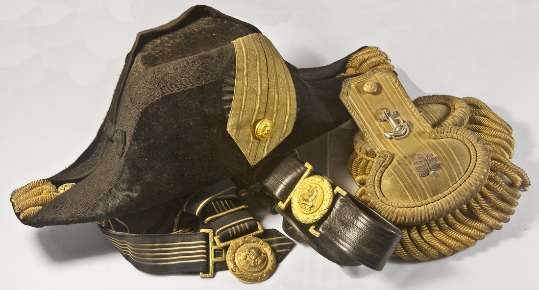 a) Leather case with dress fore & aft hat, epaulettes with commander's silver oak leaves, two dress sword belts and hangers;