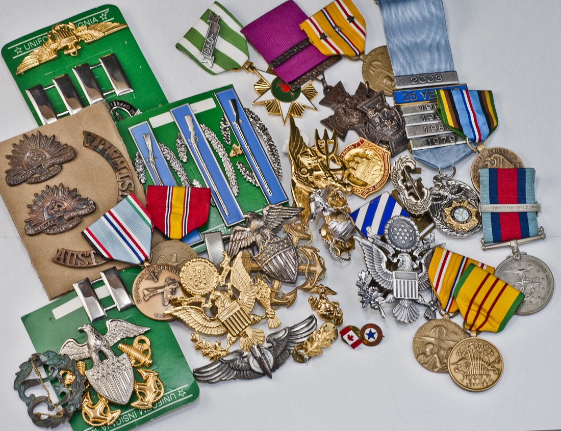 Lot of US and other Military Medals and uniform badges and insignia. Normandy Campaign Veteran's Medal in Royal Mint case of issue, US Campaign, WWII-related, etc medals (10), Vietnam medal with bar, WWI Service medal 1917-1918 with star, two copies of Victoria Crosses, others (2). Nearly all on ribbons. Extremely Fine or better; Badges (48+) - hat, lapel, buttons, etc.; mostly from manufacturers. (65+)