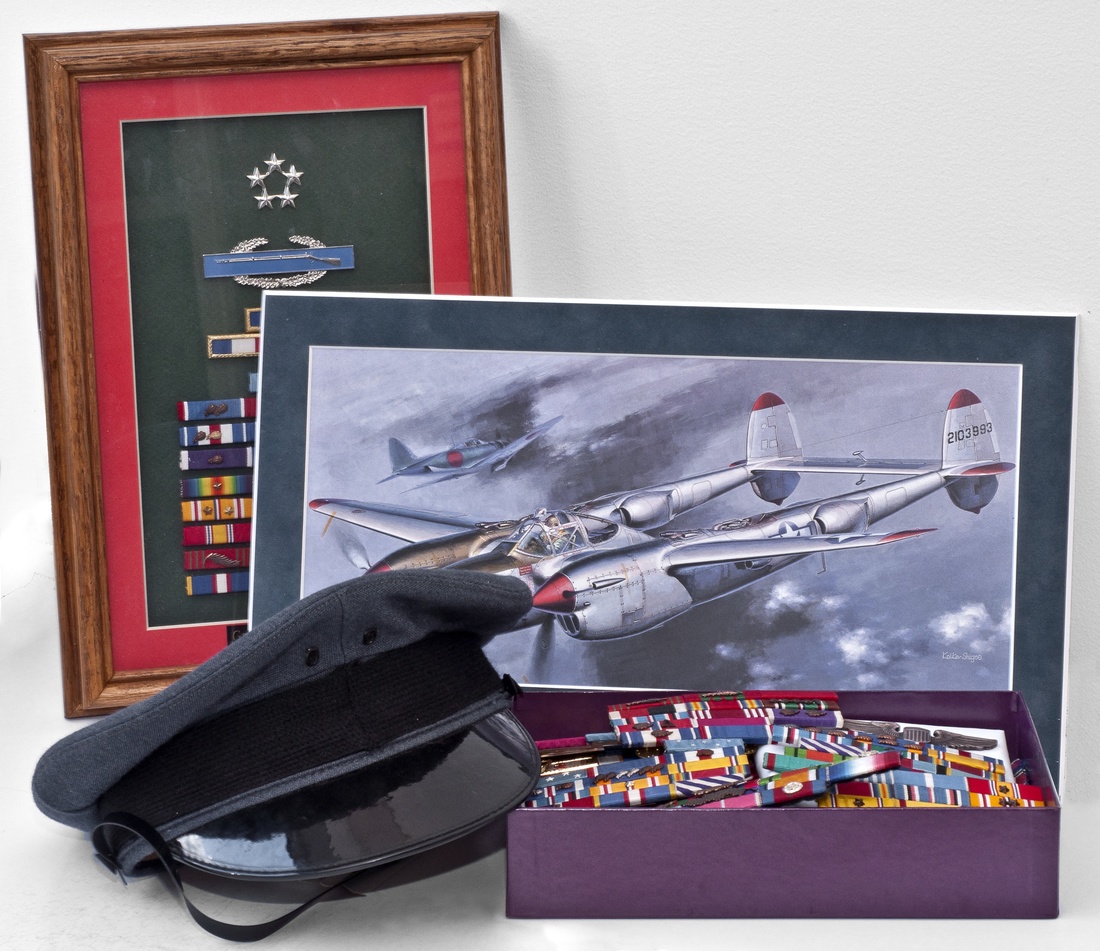 US ribbon bars, ribbons and assorted Militaria and paraphernalia - some British: Mounted ribbon bar large groups (8), miscellaneous single bars and ribbons, framed ribbon bar display group representing Gen. MacArthur's medals; Navy tunic, RAF cap, paratrooper's beret, US Army issue WWII era New Testament; autobiography of Mitchell Paige, US Marines; other Militaria-related paper items. All well-preserved. (102+)