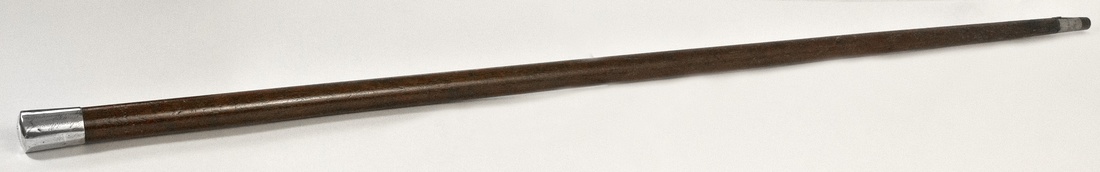 Late 19th Century English or American walking cane. Unmarked silver top band, engraved "Taken out of house in which Jas. G. Blaine was born" and "A.D. Young" at top (referring possibly to James G. Blaine, US statesman, born in PA, Representative for Maine, 1863-1876). Typical wear.