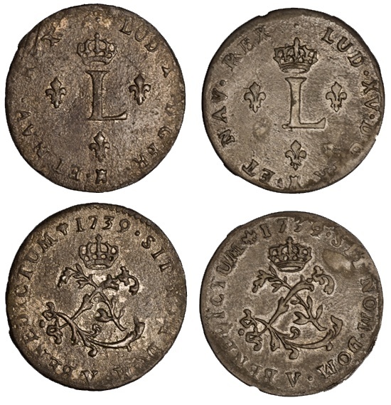 French Colonies. Used in North America. Pair of Billon Sous-Marque, 1739 V. Troyes. Varieties. Lily/tower differents, stop after tower; eagle/tower differents. Vlack 191 a (R8), 192 (R4). The latter double struck. Extremely Fine. Ex Robert A. Vlack. (2)