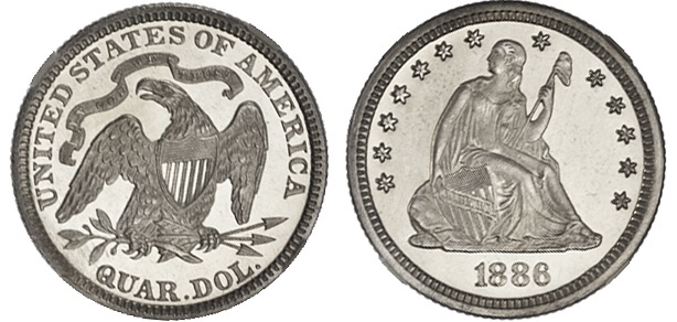 1886 Liberty Seated Quarter. NGC PF 67+ Cameo. CAC verified. Snowy types in wells of reflectivity, a superior example.