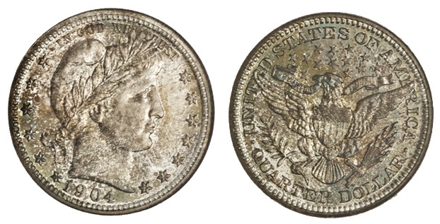 1904 Barber Quarter. NGC PF 68. Lovely pale blue, gold and vermilion iridescent hues in lustrous fields with superb types.