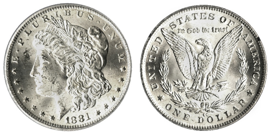 1881-CC Morgan Dollar. Brilliant Uncirculated. Frosty white, in the original government plastic (no box or papers).