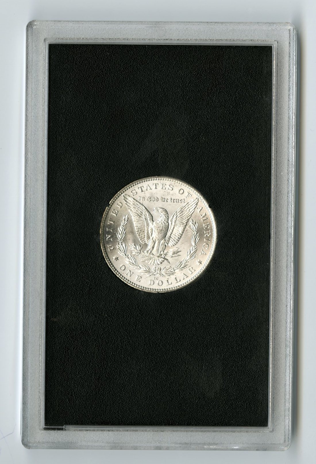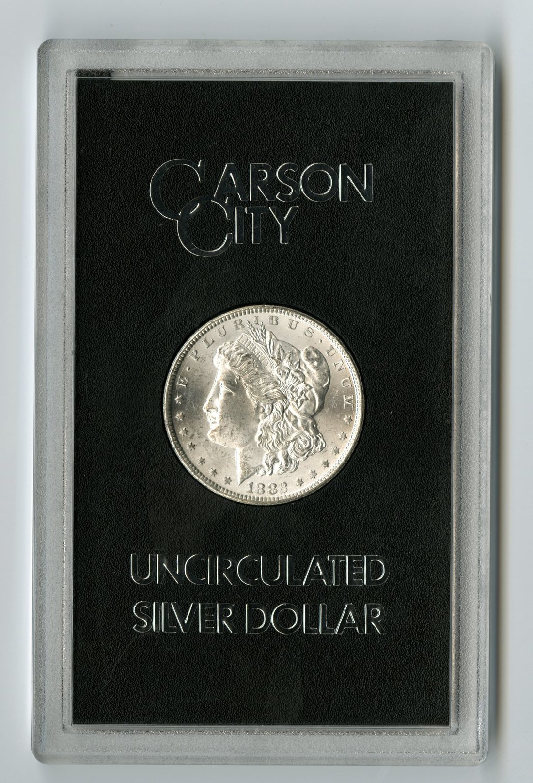 1882-CC Morgan Dollar. Brilliant Uncirculated. Frosty white, in the original government plastic (no box or papers).