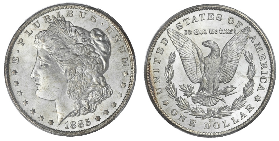 1885-CC Morgan Dollar. PCGS MS 67. Frosty, bold devices and resplendent lustre give this choice example excellent eye appeal.