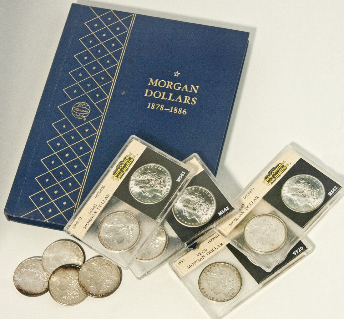 Morgan Dollar Album and Other Morgans. 1878 7F VF-EF; 1879 AU; 1880-S beautifully toned Gem BU; 1881-S BU; 1882-O nicely toned BU; 1882-S rainbow toned Very Choice BU; 1883 nicely toned BU; 1884-O cull; 1884-O nicely toned Choice BU; 1885 nicely toned BU; 1885-O nicely toned Very Choice BU; 1886 toned BU. Also included 1897 Choice BU; 1897-S Choice BU; 1900 Choice BU; 1901-O Choice BU. The following Morgan Dollars are in Photo-Certified Coin Institute holders: 1883-O "MS-62;" 1891 "VF-20;" 1898-O "MS-61;" 1899-O "MS-62." [20]