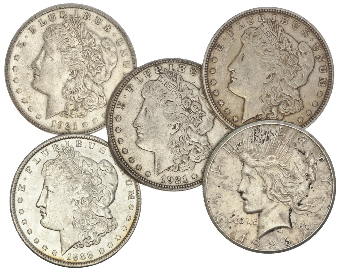 Quintet of Silver Dollars: 1888. Uncirculated; 1921 Morgan plain, "D" and "S". VF-EF; and 1926 AU. (5)