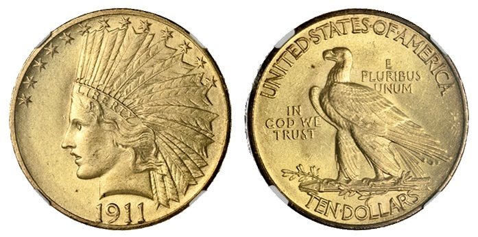 1911 $10 Indian. Very Choice Brilliant Uncirculated. NGC MS64.