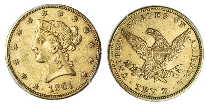 1861 Liberty $10. PCGS AU58. During the first year of the War Between the States, the Philadelphia Mint struck only 113,100 pieces. Near mint condition examples from this year are always popular. The fairly bright and lustrous yellow-gold surfaces on this example have some contact marks, and a there is a small scratch near the date. The strike is bolder than usual; the centers of the stars are clear, and the olive branches show decent details. Recent auction records indicate rising demand, so bid accordingly.