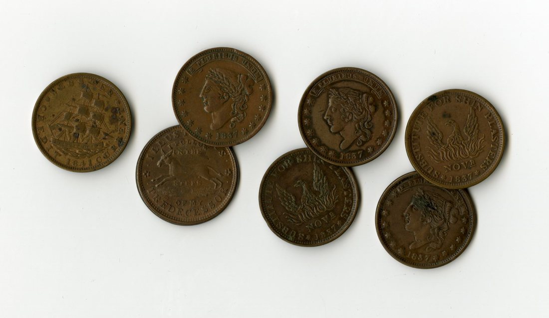 Hard Times Tokens. A Useful Grouping of Patriotic and Political Themes. HT-16. Low-58. Daniel Webster. EF, toning spots; HT-33. Low-19. 1837. Turtle. EF, brushed; HT-45. Low-30. Liberty - One Cent. VF-EF, minor rim bruise; Similar, HT-46. Low-31. EF details, stains; Similar, HT-52. Low-39. EF, toned; HT-66A. Low-47A. Phoenix. May 10th. Traces of silver. EF. Minor rim bruise; Similar, HT-67. Low-48. EF, stains. [7]