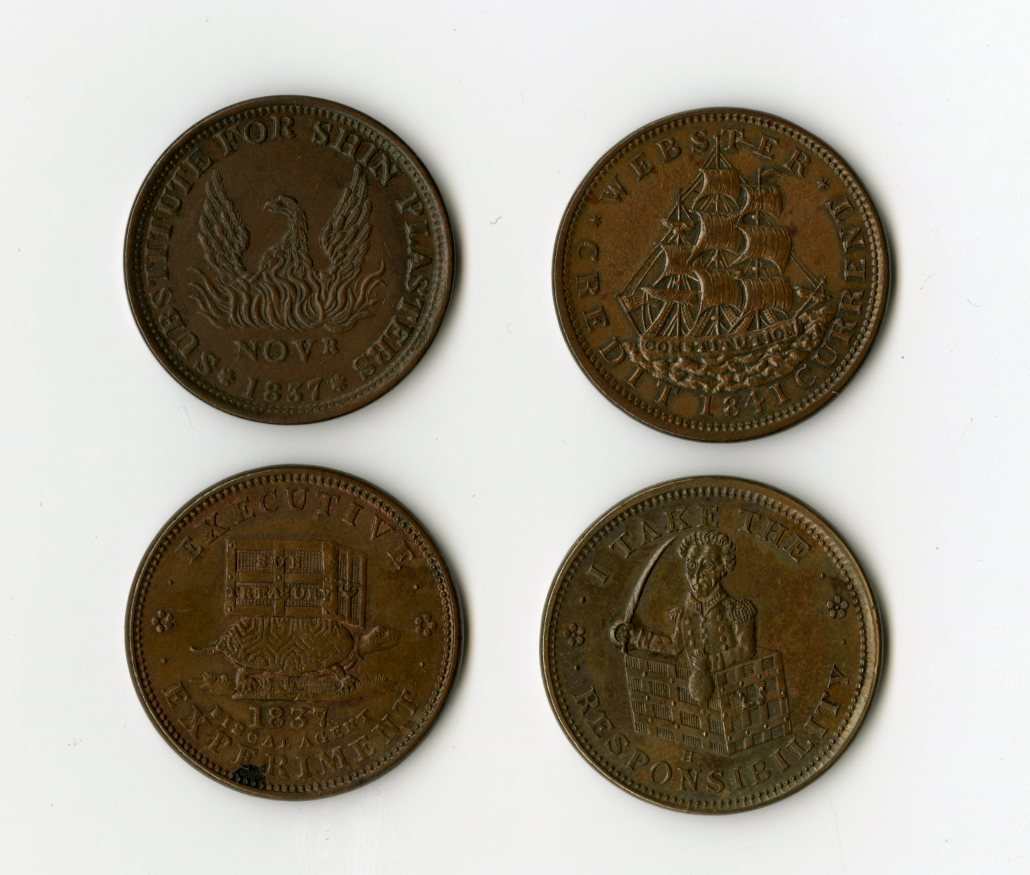 Hard Times Tokens. Assortment of Higher Grade Examples with Minor Impairments. HT-20. Low-62. Webster. AU details; HT-33. Low-19. Turtle. Uncirculated, stain; HT-66. Low-47. Pheonix. Uncirculated, slight bend; HT-70. Low-5. Jackson. AU details. [4]
