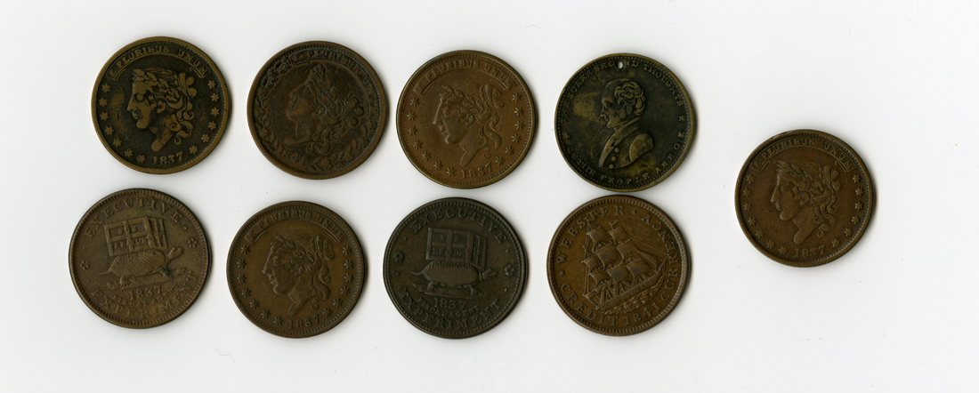 Hard Times Tokens. Selection of Patriotic and Political Themes. HT-22. Low-64. 1841. Daniel Webster; HT-32. Low-18. 1837. Turtle; Similar, HT-34. Low-20; HT-48. Low-33. Liberty - One Cent(2 pcs.); Similar, HT-61. Low-37; Similar, HT-62. Low-38; HT-64. Low-68. 1841. Liberty - Mint Drop; HT-75. Low-56. Van Buren. Holed, and dark. All VF to EF. [8]