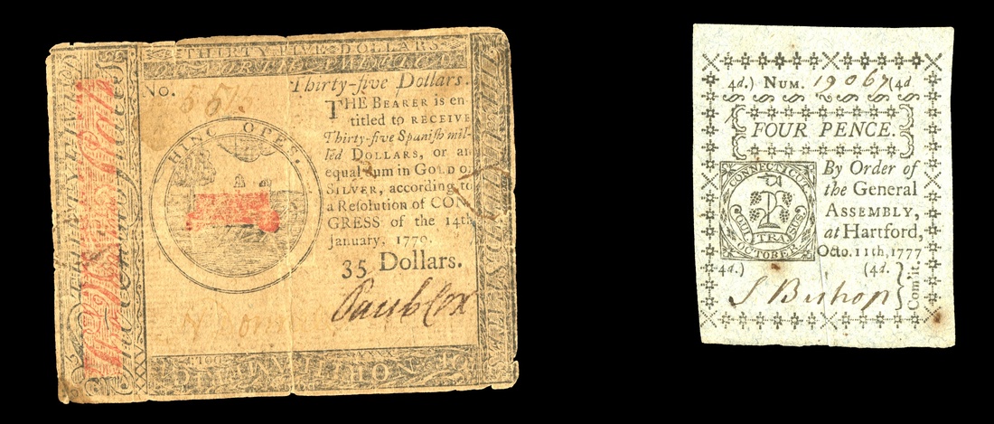 Connecticut Small Change Bills and Other Colonial and Continental Items.  Connecticut. Oct. 11, 1777. All with slash cancels. Two Penc, blue, EF; Three pence, white(2 pcs.), VF, EF; Three pence, blue(2 pcs.) both EF or so; Four pence, blue, Uncirculated; Continental Currency, Jan. 14, 1779 $35, Fine, rounded corners; Maryland. Aug. 14, 1776 $2/3, About Fine. [8]