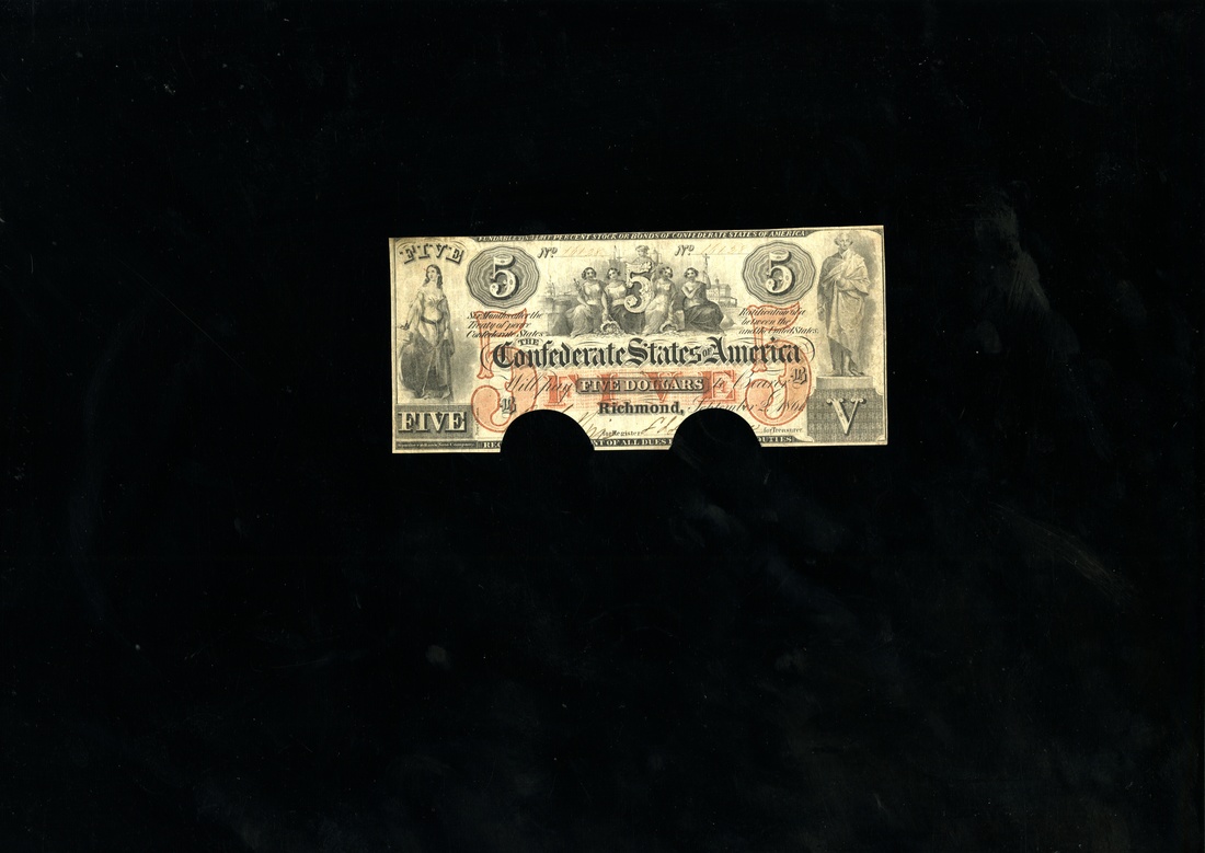 CSA. T-31. $5. 1861. Cr. 244. PF-1. No.16128. B. Five women. Red underprint. Southern Bank Note Company. Red serial numbers, and perhaps the lowest reported thus far. Fine. Cut out cancelled at the bottom.