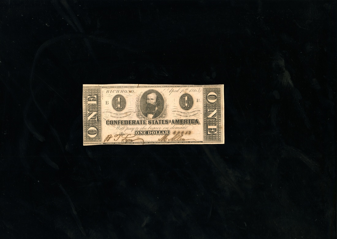 CSA. T-62. $1. 1863. Like PF-5. No.77753. B. Clement Clay. Pink paper. 1st series. Period after right plate letter. Left plate letter too low. Fricke lists only H plate letters for this variety. Uncirculated. The signatures and serial number are a bit fuzzy. Full margins on sides. Light archival pencil notation on the back. Three examples of this variety came to light in this consignment, and to the best of our knowledge, there are no others. Not listed in Fricke.
