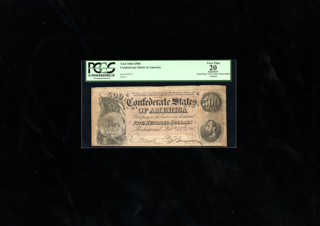 CSA. T-64. $500. 1864.  No.28871. Very Fine 20. Apparent. Small Edge Tears; Minor Rust Stains on Back.