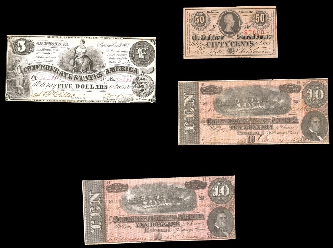 CSA Note Grouping. $5 1861 CT-36/278A. #170288. Uncirculated. Also included are two $10 1864 examples in Fine, one trimmed in at right, and an 1863 50 Cents First Series VF-EF. [4]