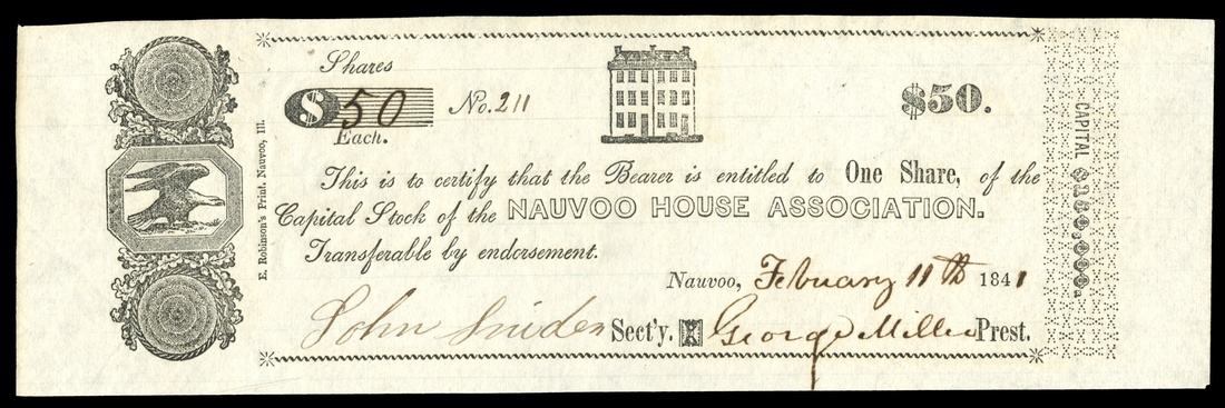 Illinois. Nauvoo. Nauvoo House Association. $50. Feb. 11, 1841. (Rust 30) No.211. Three story building. Eagle in the left end panel. Signed by George Miller and John Snider. "…the Bearer is entitled to One Share, of the Capital Stock…Transferable by endorsement…" The small format, and ability to be transferred by endorsement indicates that these were utilized as a medium of exchange. E. Robinson's Print, Nauvoo, Ill. Choice Uncirculated. From the Collection of John Herzog.