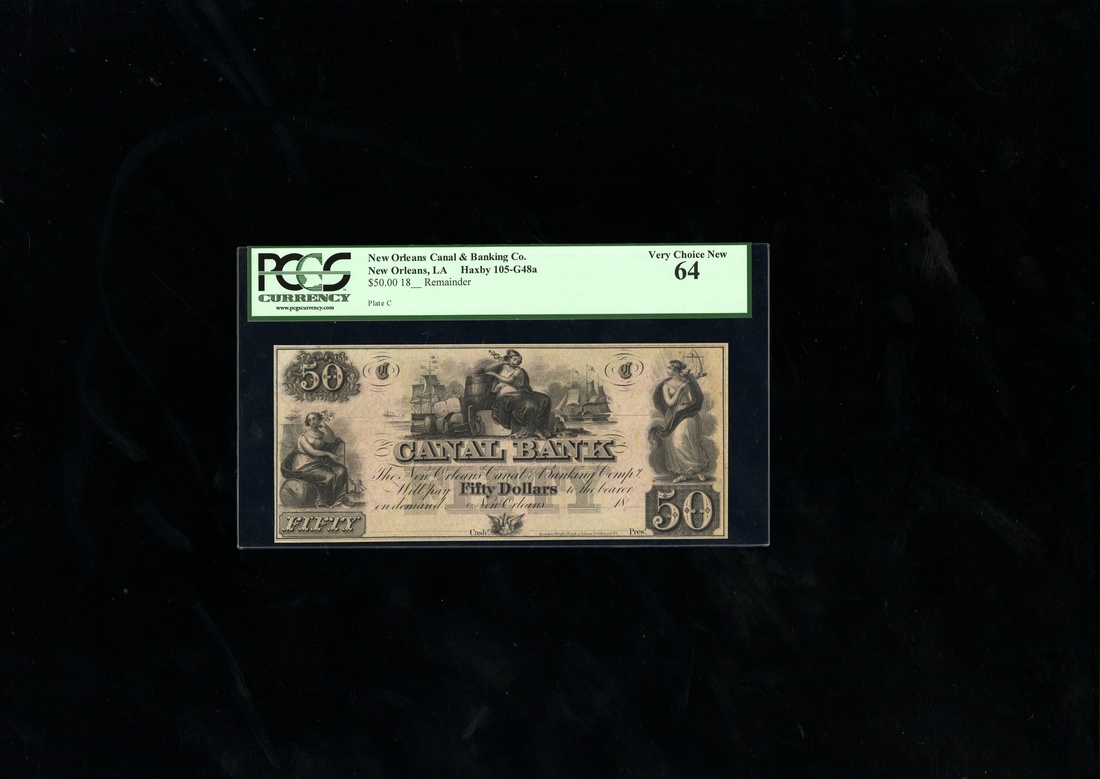 Louisiana. New Orleans. Canal Bank. $50. Woman by barrels. LA105-G48a. Very Choice New 64. Unissued remainder.