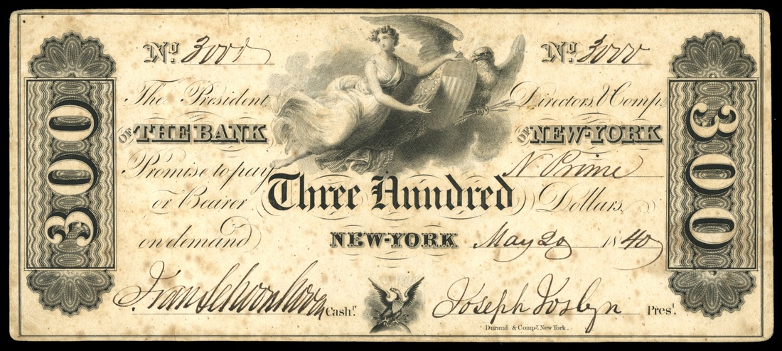 New York. Bank of New-York. $300. May 20, 1840. (NY-1790 G182) Proof on card. No.3000. Young woman, eagle and shield. Eagle on globe below. Durand & Comp. EF. From the Collection of John Herzog.