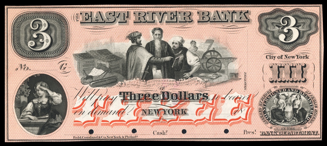 New York. East River Bank. $3. 1850s. (NY-1570 G10) Proof on India paper. Red tint. Faust, Guttenberg, Schoeffer. Girl with hand to forehead. Bald, Cousland & Co. PMG 62 Uncirculated. From the Collection of John Herzog.