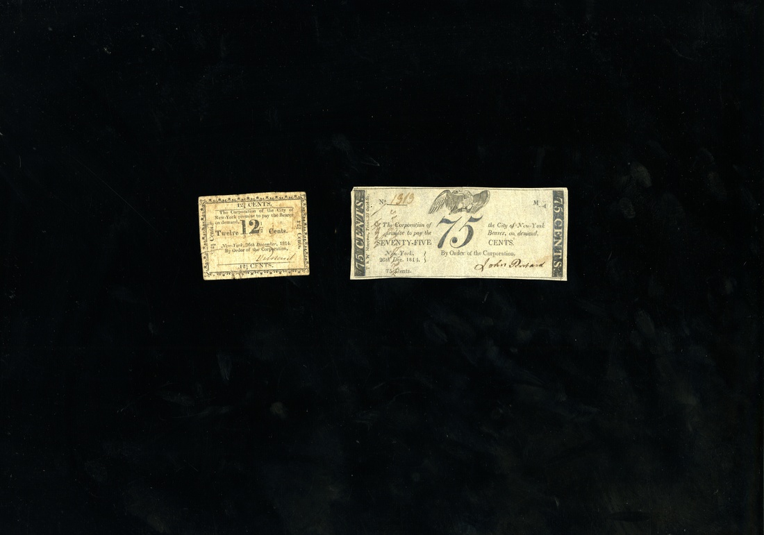New York. Corporation of the City of New York. 12 1/2 & 75 Cents. Both Dec. 26, 1814. (H58 & H62) H58 with Hope seated on a rock on the back. Fine detail, but with edge tears and splits; H62 with eagle. Signed by John Pintard. Contemporary counterfeit. Very Fine . T & W Mercien, Print. From the Collection of John Herzog. [2]