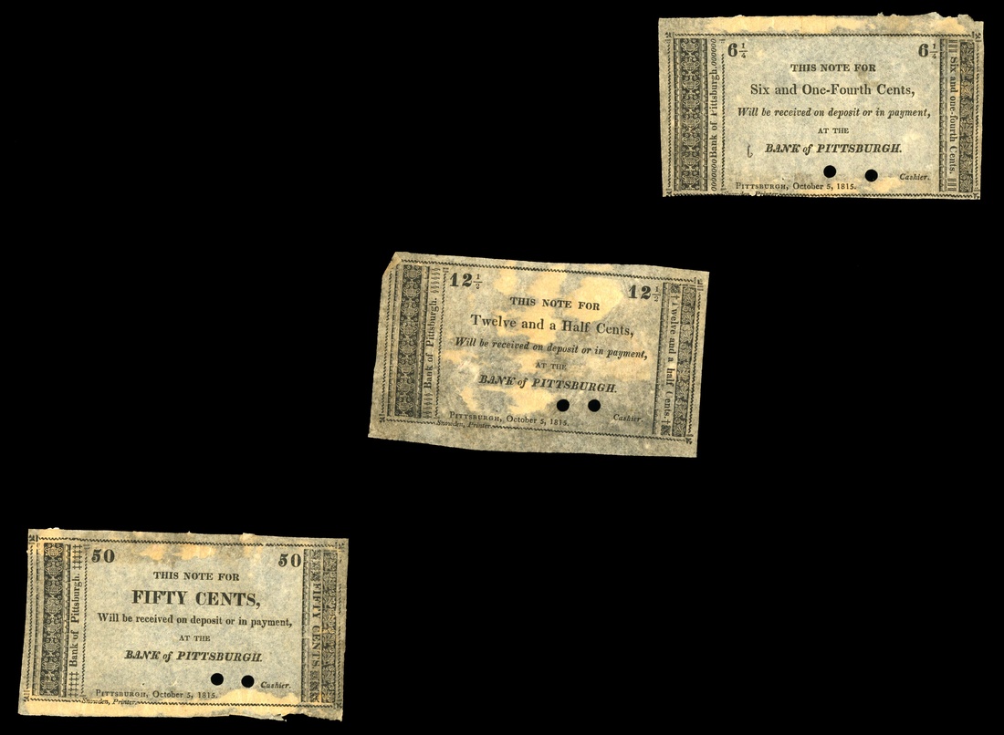 Pennsylvania. Bank of Pittsburgh Scrip Note 1815 Trio. 6 1/4, 12 1/2, and 50 Cents. All three AU to Uncirculated, with mounting remnants confined to the backs. All unissued, punch cancelled. These are rarely seen. [3]