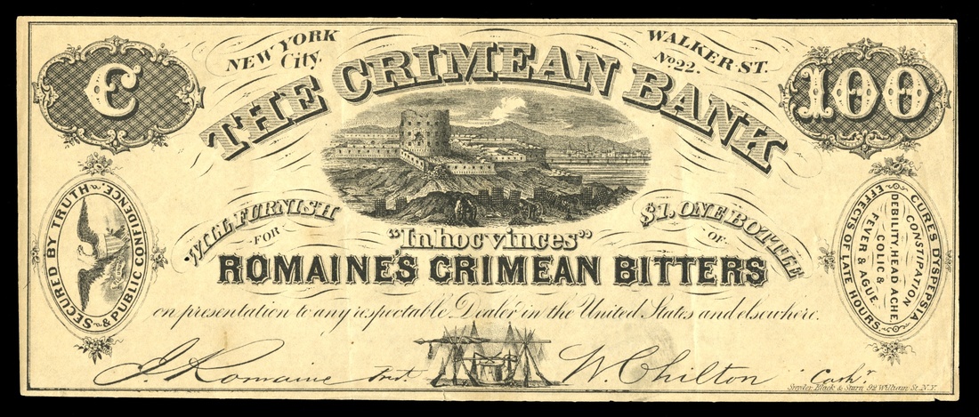 New York, New York. Crimean Bank $100. Castle in ruins. Advertising note for Romaine's Crimean Bitters. No. 22 Walker Street. Oval in the right end panel with "CURES CONSTIPATION, DEBILITY, HEAD ACHE, COLIC, FEVER & AGUE, EFFECTS OF LATE HOURS. Very Fine.