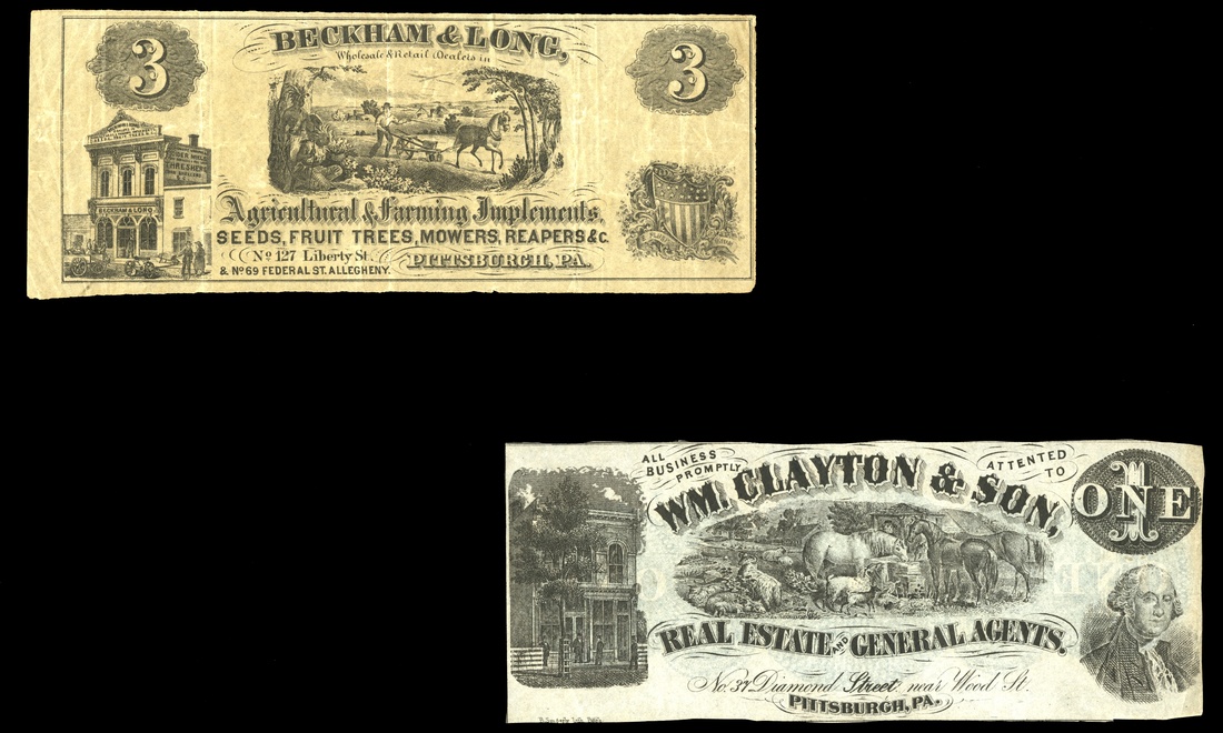 Pair of Pittsburgh Advertising Notes. Beckham & Long advertising note. $3. Farmer plowing, store at left. 127 Liberty St. & No.69 Allegheny. Architectural & farming implements. VF. Formerly Lot 562 from the Early American History Auction, June 27, 1998, where the note was described as "potentially unique" by the cataloger; Wm. Clayton & Son. Real estate and general agents. Horses and goat drink at a well. Building, left. Washington, right. AU, but trimmed into the borders. [2]