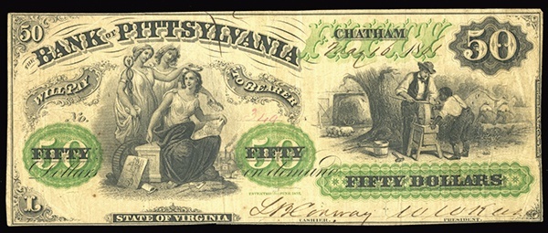 VA. Chatham. Bank of Pittsylvania. $50. 1861. No. 349. Green overprint. Fieldhand turns grinding wheel. Three women. American Bank Note Company. VF.