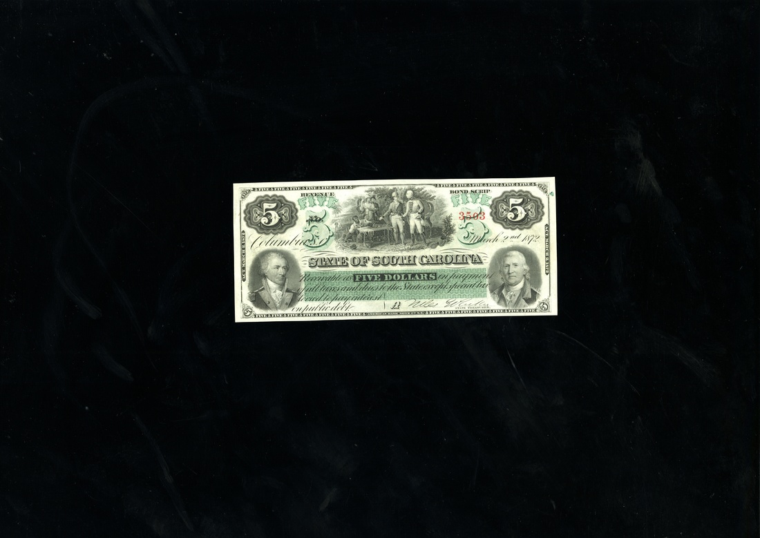 SC. State of South Carolina. $5. Columbia. March 2 1872. Vignette of General Marion's Sweet Potato Dinner (Cr-5). Small diagonal crease. EF-AU.