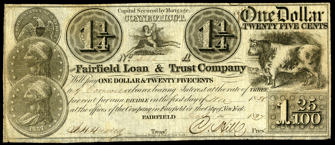 Connecticut. Fairfield. Fairfield Loan and Trust Co. $1.25. 1837. Fully issued. No.340. Cherub on deer flanked by counters with 1 1/4. Two half dollars, and one quarter form the left end panel. Cow, right. Rawdon, Wright & Hatch. Very Fine.