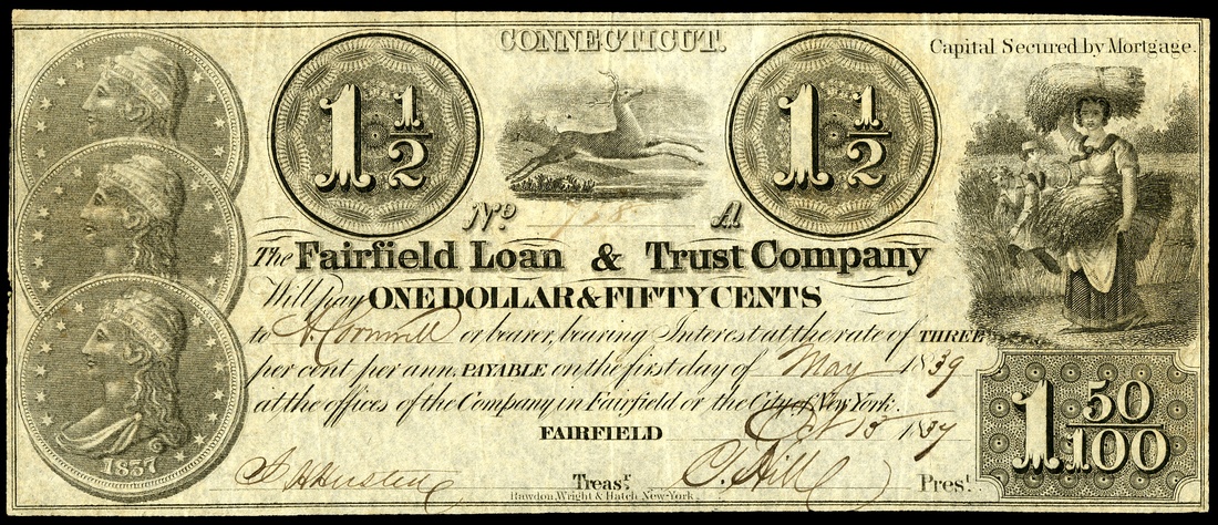 Connecticut. Fairfield. Fairfield Loan and Trust Co. $1.50. 1837. Fully issued. No.758. Deer flanked by counters with 1 1/2. Three half dollars. Girl with wheat, right. Rawdon, Wright & Hatch. Very Fine.