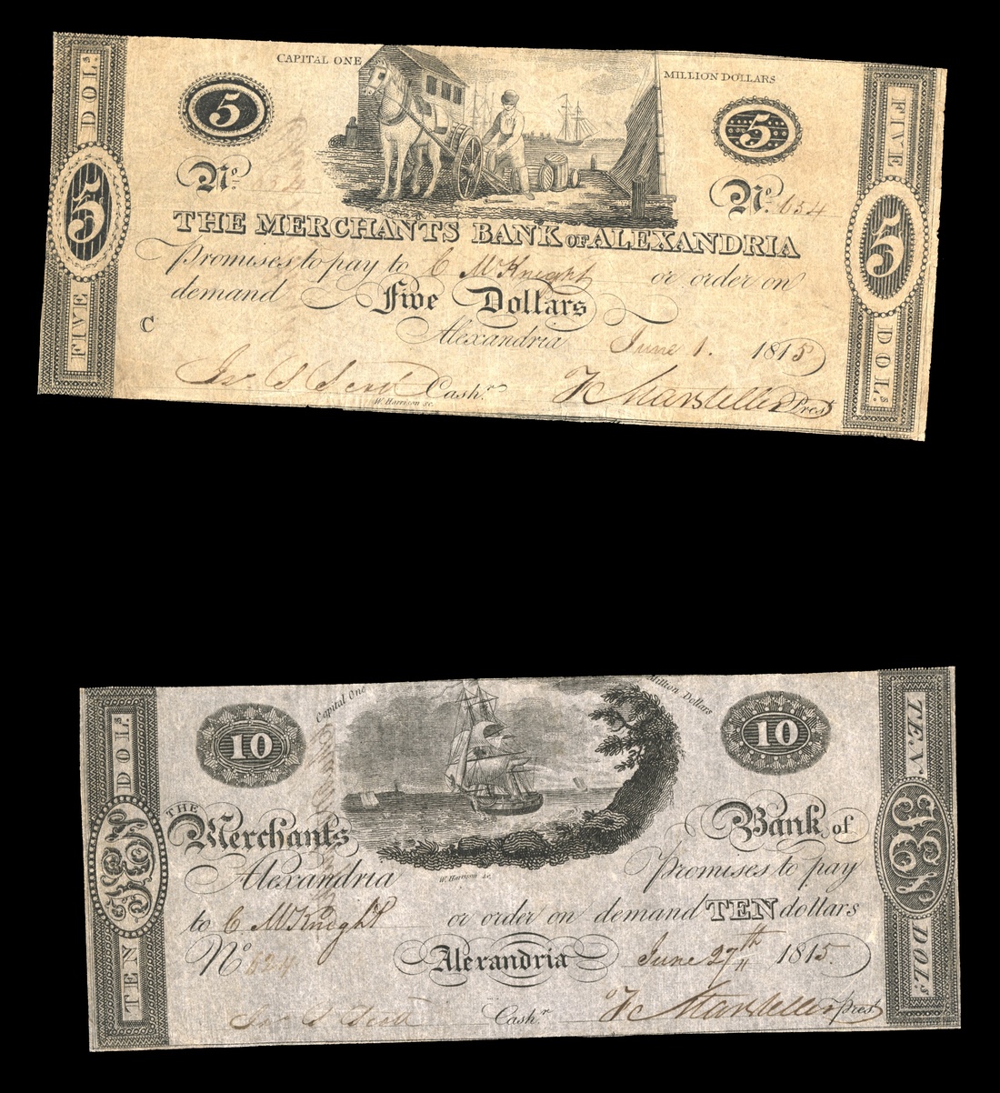 District of Columbia. Pleasing Pair of Merchants Bank of Alexandria Obsolete Bank Notes. $5, DC-25 G18, man loads wagon, VF; $10 G22, VF-EF. Rarely found this nice. [2]