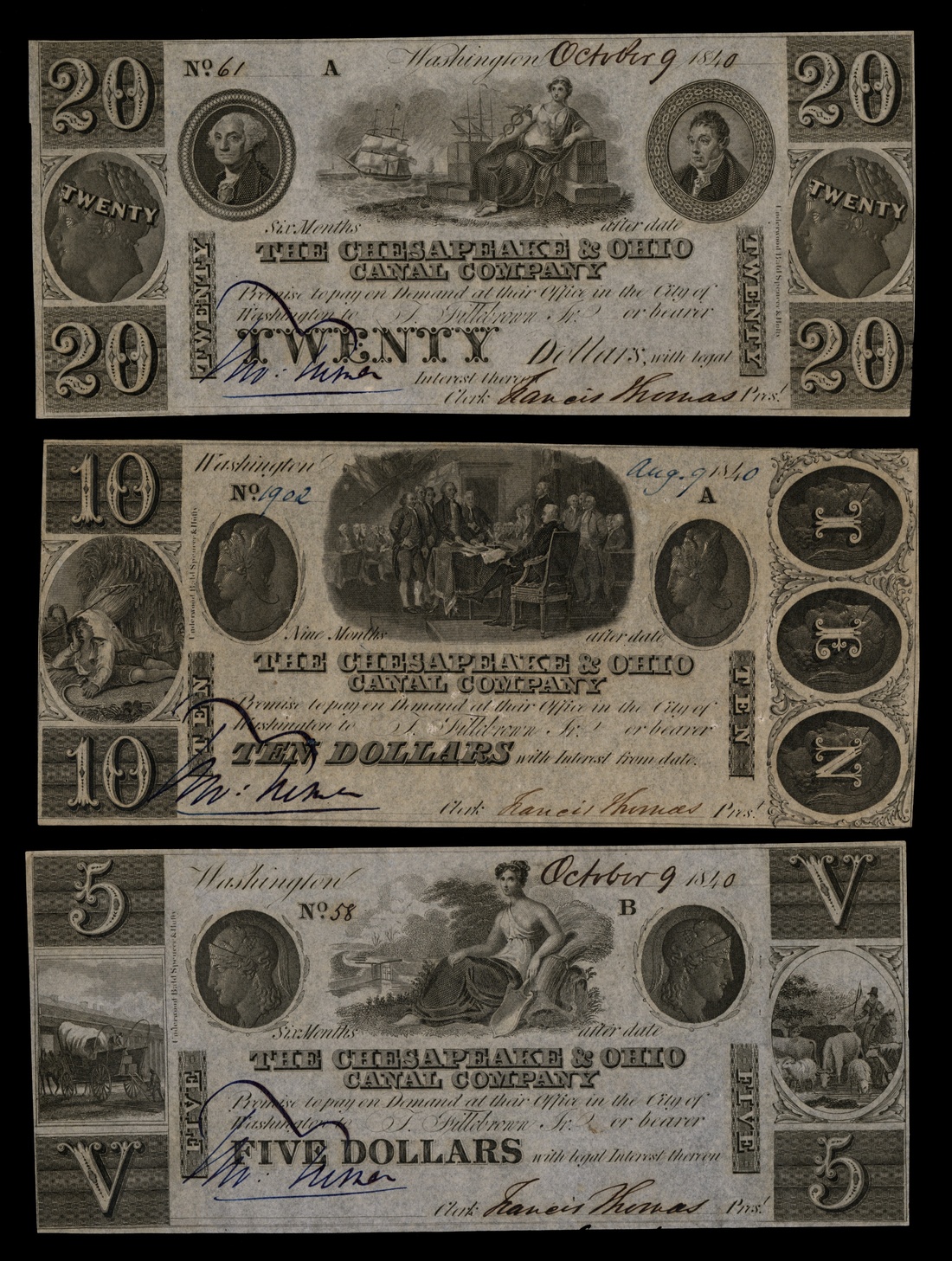 Trio of Chesapeake & Ohio Canal Company Notes. Washington, DC. All 1840. $5, $10, $20. UBSH. All AU-Uncirculated. The $20 trimmed slightly into the border at right. Patriotic scene on the $10. [3]
