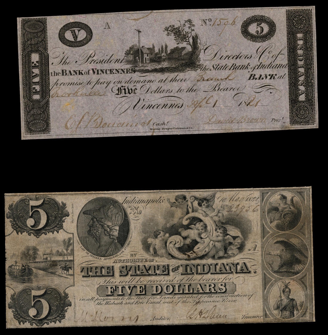 Pleasing Pair of Indiana Obsoletes. Indianapolis, By Authority of the State of Indiana $5 1856, for construction of the Wabash and Erie Canal. Five cherubs, Fine; Bank of Vincennes $5 1821, IN-665 G112, Unc. [2]