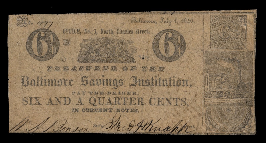 Maryland. Baltimore. Baltimore Savings Institution 1840 Assortment. 6 1/4 Cents 5.13.2 R-5 Good details but missing the left end; 12 1/2 Cents 5.13.5 R-4 VG-Fine, light stains; 12 1/2 Cents 5.13.6 R-4 details, repairs; 12 1/2 Cents 5.13.8 R-3 Fine; 25 Cents 5.13.9 R-3 Fine, light stains; 25 Cents 5.13.10 Fine; 50 Cents 5.13.14 Fine details, minor stains; $2 5.13.20 R-5 VG details, trimmed in a bit. [8]