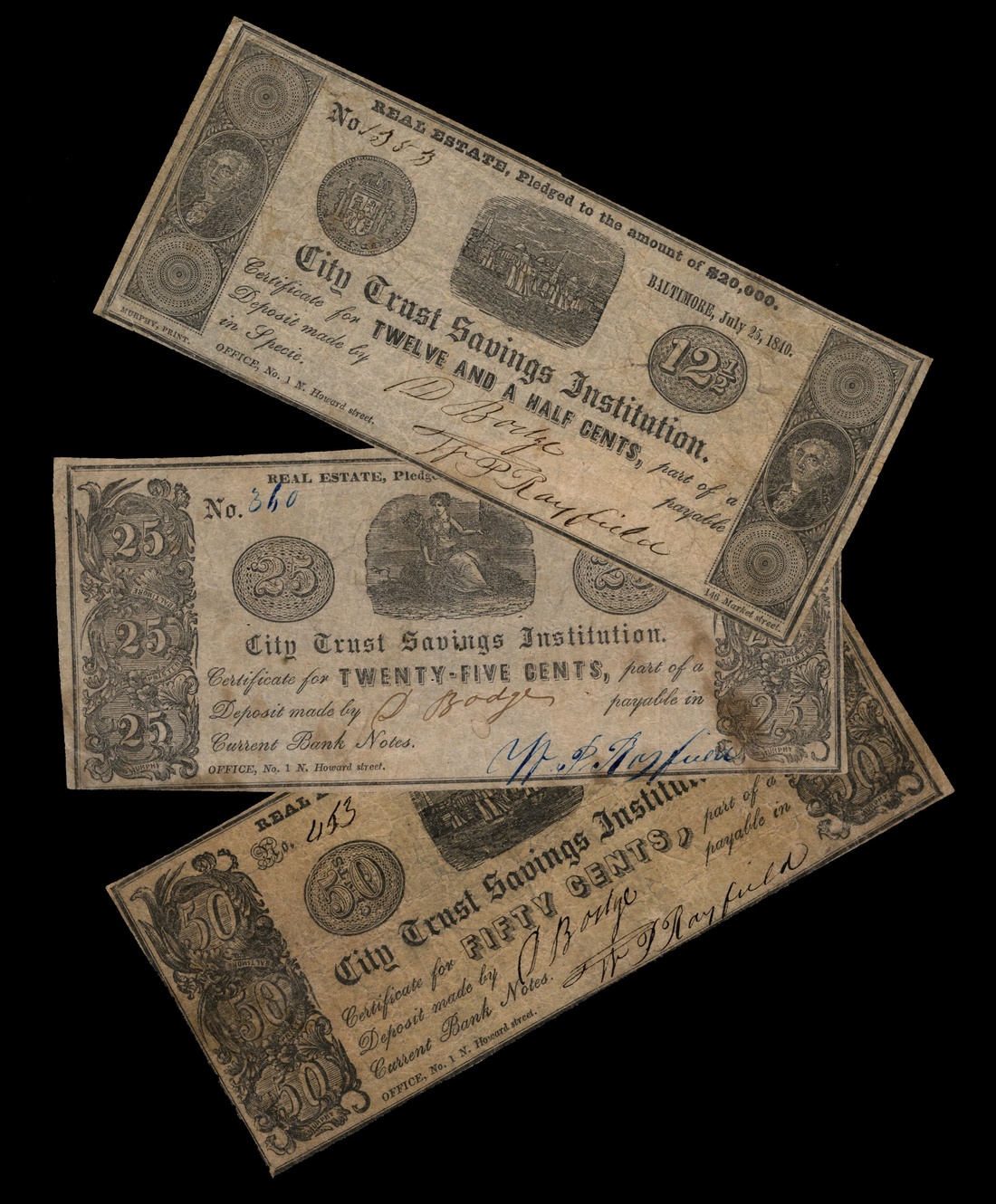 Maryland. Baltimore. City Trust Savings Institution 1840 Trio. 12 1/2 Cents 5.30.3 R-5, ships, Spanish coin, Fine; 25 Cents 5.30.5 R-3, woman, Fine, pinholes and light stain; 50 Cents 5.30.7 R-5, ships, Fine. [3]