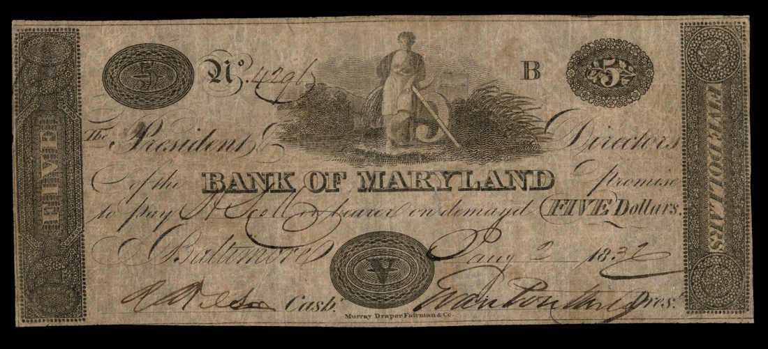 Maryland. Baltimore. A Nice Bank of Maryland Offering. $5 1832 MD-95 G36 woman with wheat, Fine; $5 G40 woman with children , VF; $5 G44 man with cattle, VF; $10 G52 woman flanked by 1 and 0, Fine; $20 G60 woman and man flank 20 in shed, Fine, minor repair; $50 G68 woman flanked by 5 and 0, About Fine. [6]